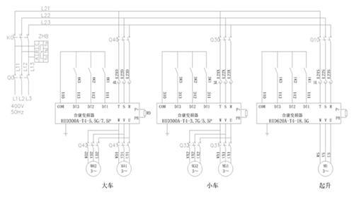 2、大车行走机构采用HID300A系列变频器同时控制两台电机实现正反转,高速低速转换。
