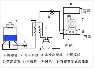 该空调系统为风管式系统,风冷风管式中央空调系统与其他中央空调相比有新风的引入提高的空气的质量、温度较均衡、噪音小、可调节、安装简单、运行可靠、效率高和运行费用低等显著特点。风管机中央空调系统以空气为输送介质,其原理与大型全空气中央空调系统的原理基本相同,是一个小型化的全空气中央空调系统。它利用室外主机集中产生冷/热量,将从室内引回的回风进行冷却/加热处理后,再送入室内消除其空调冷/热负荷。风管式机组系统简单,采用制冷剂和空气直接蒸发换热的制冷循环方式,无需中间传热媒体,减少了损耗,效率高。由于引入了新风,其空气品质能得到较大的改善。原理图如下所示,图中室外主机采用风冷方式。