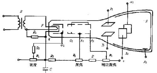 电子枪由灯丝(F)、阴极(K)、栅极(G1)、前加速极(G2)(或称第二栅极)、第一阳极(A1)和第二阳极(A2)组成。它的作用是发射电子并形成很细的高速电子束。灯丝通电加热阴极,阴极受热发射电子。栅极是一个顶部有小孔的金属园筒,套在阴极外面。由于栅极电位比阴极低,对阴极发射的电子起控制作用,一般只有运动初速度大的少量电子,在阳极电压的作用下能穿过栅极小孔,奔向荧光屏。初速度小的电子仍返回阴极。如果栅极电位过低,则全部电子返回阴极,即管子截止。调节电路中的W1电位器,可以改变栅极电位,控制射向荧光屏的电子流密度,从而达到调节亮点的辉度。第一阳极、第二阳极和前加速极都是与阴极在同一条轴线上的三个金属圆筒。前加速极G2与A2相连,所加电位比A1高。G2的正电位对阴极电子奔向荧光屏起加速作用。