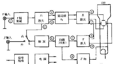 被测信号①接到“Y"输入端,经Y轴衰减器适当衰减后送至Y1放大器(前置放大),推挽输出信号②和③。经延迟级延迟Г1时间,到Y2放大器。放大后产生足够大的信号④和⑤,加到示波管的Y轴偏转板上。为了在屏幕上显示出完整的稳定波形,将Y轴的被测信号③引入X轴系统的触发电路,在引入信号的正(或者负)极性的某一电平值产生触发脉冲⑥,启动锯齿波扫描电路(时基发生器),产生扫描电压⑦。由于从触发到启动扫描有一时间延迟Г2,为保证Y轴信号到达荧光屏之前X轴开始扫描,Y轴的延迟时间Г1应稍大于X轴的延迟时间Г2。扫描电压⑦经X轴放大器放大,产生推挽输出⑨和⑩,加到示波管的X轴偏转板上。z轴系统用于放大扫描电压正程,并且变成正向矩形波,送到示波管栅极。这使得在扫描正程显示的波形有某一固定辉度,而在扫描回程进行抹迹。