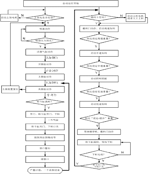 该自动称量充填包装机是由上料、称重与下料料部分组成。上料部分分为储料斗和重力供料装置。储料斗用于存储需要充填的物料,重力供料装置主要是向称量料斗中提供物料。称重部分即称量斗,它通过和称重传感器相连,测量物料重量。下料部分用来完成重量物料的下料装袋。其工作流程是:人工协助上袋、自动称量、夹袋、充填、振动、推袋、经传送带传递进行自动缝包或封口。通过改变给料方式,适应于包装超细粉到大颗粒物料的敞口袋定量包装。其工作流程如图1: