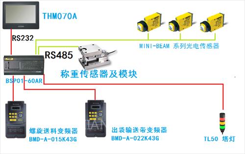 该自动称量充填包装机的操作和控制要求,控制系统选用Banner公司的BSP01 系列PLC,此系列的PLC 具有结构紧凑、模块化、可扩展性强、指令集丰富等特点。对外界接口具有很强的适应性。并且1 个RS485 通讯口1个RS232编程口,具有标准Modbus通讯协议。重量处理通过PLC的RS485通讯口和称重模块通讯得到实时重量数值;螺旋送料以及出袋输送带选用Banner公司BMD-A系列变频器驱动,BMD-A系列变频器具有32Bit处理器、响应速度快、启动转矩大、过载能力强优点,通过变频器最多16段的多段速功能实现多级加料,确保重量精度; Banner公司THM系列触摸屏对整个系统进行过程监控显示以及参数设定等功能。