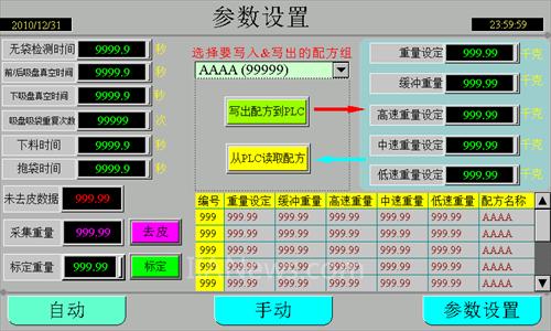 系统设计了为各功能画面,包括显示功能、参数设定功能、称的标定、自动去皮、不同物料的参数配方功能等。部分设定画面如图3: