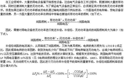 发电厂主要的用电设备为送风机、吸风机、凝升泵、循环水泵、电动给水泵、磨煤机、碎煤机、凝结水泵、空压机和输煤机等设备,除部分设备因为工艺要求加装了变频调速设备外,其它均为感应电机类负载,在工作过程中消耗大量有功功率的同时,也消耗了大量的无功功率,设备自然功率因数低下,其中最低的功率因数可能达到0.2~0.3(异步电动机轻载运行时),正常工作过程中的功率因为也仅为0.7~0.9,所以厂用电一般均配有无功补偿装置进行无功补偿,尤其以配电系统就地补偿最为高效,用来提高厂用电系统的功率因数。
