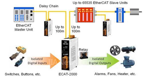 ECAT-2000采用EtherCAT标准,兼容菊花链(daisy chain)灵活的网络架构,提供您简易配置、维护成本低廉且有效的解决方案。ECAT-2000采隔离输入与输出的硬件设计,能有效承受严苛干扰与环境。
