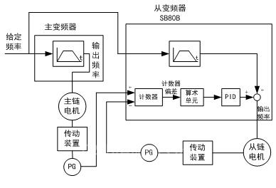考虑到不能有位置累计误差的要求,必须把位置作为一个反馈信号来控制变频器,才能达到消除累计误差的目的。因此,需在主从电机上安装脉冲编码器,利用SB70变频器的高速计数器来对编码器的脉冲进行计数,以达到记录当前位置偏差的目的。使用两台变频器分别驱动主从两台电机,主变频器可开环运行,从变频器的PID修正频率功能可以根据得到的位置偏差不停地修正输出频率,以达到位置同步。