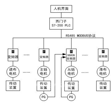 在拉幅定型机传动系统的其他部分需要和主传动速度成一定比例变化,这可以外加一个普通PLC计算后由通讯给定。下图是系统实现的框图: