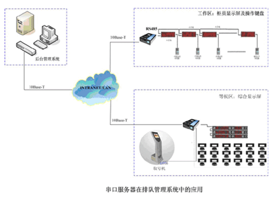串口服务器也叫终端服务器、串口/IP转换器,是一个可以让工业用RS-232/485/422串口设备立即具备联网能力的设备联网服务器。也就是可以使取号器、集中显示屏、柜员显示屏、评价器、柜员操作键盘等串行接口设备通过内部TCP/IP网络的信息节点直接与后台管理系统相连,达到不重复布线的目的。