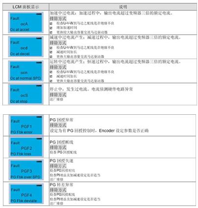 在酸洗线前期调试过程中,经常会遇到变频器出现PGF*或者OC的报警。从C2000手册故障处理部分查看,我们就很快能够分析查找问题点。