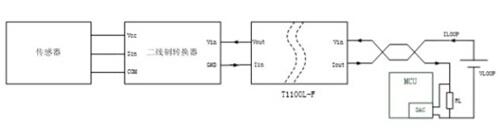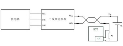 两线制转换器的功能是将两线制回路的电压Vin转换成传感器的供电电压Vcc,同时根据传感器的输入信号Sin控制两线制回路Vin的负载电流Is.这里Is就是两线制电路传输的4~20mA电流信号。