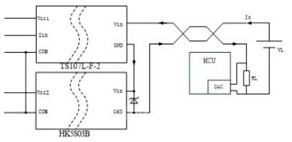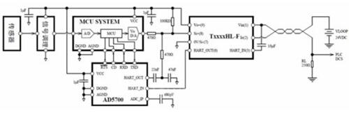 在智能仪表中,除了要传输4~20mA的模拟量信号,还要求具备Hart通信功能。这时可以采用TS107L-F-2的Hart版TS107HL-F-2.和TS107L-F-2的主要区别在于,TS107HL-F-2多了一路Hart信号隔离传输接口,如图5所示。由于TS107HL-F-2本身具备电压信号转4~20mA电流信号的功能,类似于ADI的AD5421,因此只要采用AD5700在电压信号输入端耦合进Hart信号就可以实现Hart信号的发送。Hart信号的返回则通过TS107HL-F-2的自带Hart信号隔离接口实现信号的回传。