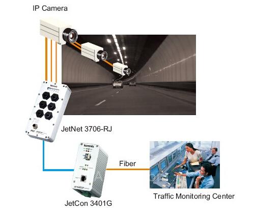 在多车的隧道内环境内,要求系统必须能够抵挡持续的震动和高湿多尘情况的影响。因此,系统集成商选用JetNet 3706-RJ交换机为隧道内的IP摄像头供电。JetNet 3706-RJ 工业PoE以太网供电交换机,满足IP67工业防护等级,防水防尘,克服了恶劣环境应用的各项难题。同时还支持IEEE802.3af以太网供电标准,无需额外铺设电源线,降低了项目实施及维护的周期和成本。实现了实时交通管理,并使用JetCon 3401G千兆光电信号转换器,提供高品质高带宽远距离连接,将现场影像传送回交通控制中心。