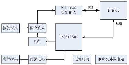 超声波检测系统由计算机、PCI-9846数字化仪、C8051F340单片机、电源、发射电路、程控放大电路组成,其整体结构如图1所示。