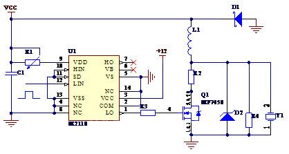 脉冲由U1的12脚输入,特别注意IR2110的选择,如果直接使用脉冲驱动IRF7450,由于隔离、驱动的原因,得不到理想的高压脉冲驱动。IRF7450是Vds=500V的MOSFET,其电流可以达到20A左右,可以满足理想开关快速切换的要求,储能线圈L1在开关的控制下产生高压,其中二极管D1与D2分别起保护作用,超声波换能器V1可以采用美国GE公司的014LJM,也可以根据应用换装其它型号。