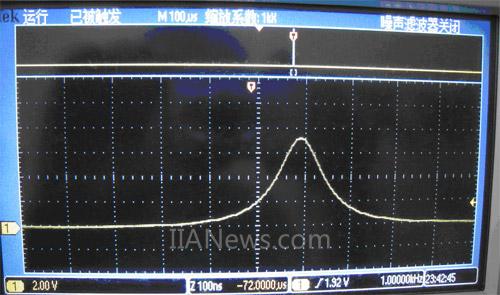图3所示为产生的高压脉冲,测量时在示波器加一个纯阻性25倍衰减头,图中纵轴为2V/格,横轴为100ns/格,使用瞬态电平激发同步,可见产生的脉冲幅度在近200V左右,脉冲宽度为300ns左右。