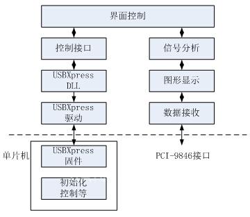 系统软件主要包括控制部分、数据接收部分和信号分析部分三个部分,控制软件决定整个系统的运行,它一方面通过USB口与总控的单片机进行通信,统一控制整个系统的发射、接收等过程,同时通知数据接收软件进行数据接收并显示。数据接收软件则只负责将PCI-9846采样的数据存储到指定位置,信号分析软件则完成采样信号的显示、分析处理等过程。整个程序框架如图4所示。