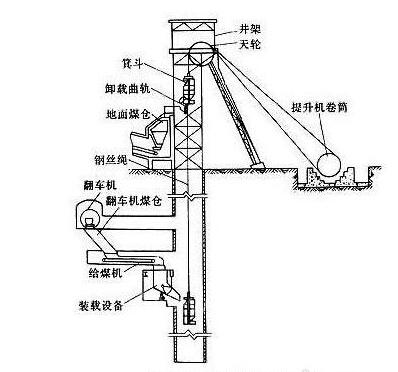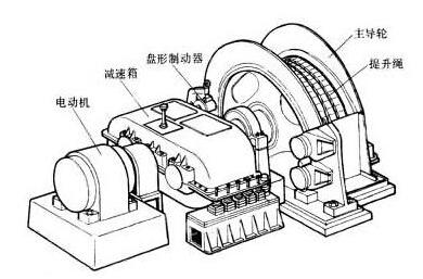 矿井提升机的主要结构由电动机、减速箱、盘形制动器、液压站、滚筒、钢丝绳、深度指示器等部分组成;它采用电动机连接减速机驱动滚筒带动钢丝绳从而拉动容器在井筒中升降,完成输送任务,减速和停车时采用液压站配合盘形闸制动,见下图: