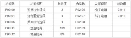 考虑到低频转矩问题,变频器采取闭环矢量控制模式,故调试前需对电机参数进行自学习。参数自学习有静态与动态两种。在负载及减速机无法脱开的情况下,需进行静态参数自学习。自学习前必须正确输入电机的铭牌参数(P2.01-P2.05),自学习后可检测出电机的定子电阻、转子电阻以及电机的漏感。