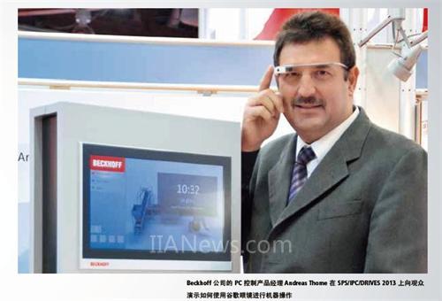 去年在德国纽伦堡举办的“2013 年德国纽伦堡工业自动化及元件展览会(SPS/IPC/DRIVES 2013)上,Beckhoff 展出了通过专注于谷歌眼镜的技术研究开发而成的针对机械操作的最新解决方案。有了具有上网功能的谷歌眼镜,状态或对话消息可以通过一个头戴式显示器直接投射到人眼中。在线信息和通信也可以用这种创新的设备实现,且错误信息可以使用触摸板进行确认。Beckhoff 公司的 PC 控制产品经理 Andreas Thome 坚定地认为,谷歌眼镜是互联网和自动化技术相融合推动工业 4.0 发展的最突出的例子。
