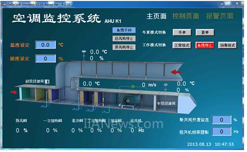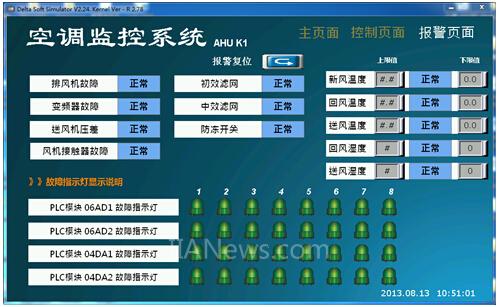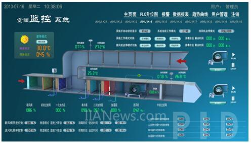同时,监控系统将会监视新风温度,送/回风温湿度,送风风速,对超标的环境参数进行报警,并做电子记录。对于空调箱和PLC、变频器等设备的故障,监控系统也将进行监控,以保证维护人员能够及时有效地查看整个系统的运行状况,快速准确地查询和分析设备故障,保证系统正常运行。