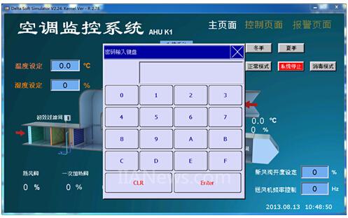 b) 在设置【温度设定】值、【湿度设定】值,调整【新风阀开度】、【送风机频率控制】参数时,会弹出密码输入对话框提示用户输入密码,以开启控制页面,若密码输入不正确,则无法打开控制页面,防止非工作人员误操作。