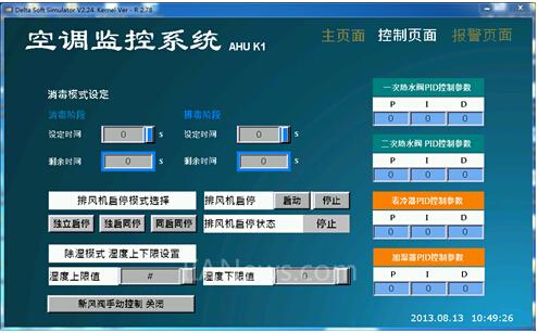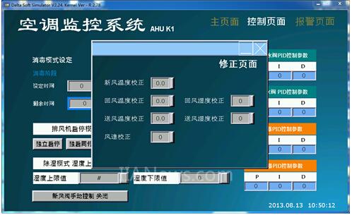 与人机界面控制功能相似,此画面为空调监控画面,可直观地查看并设定温湿度、风速、风机频率,选择工作模式、季节模式、排风机启停模式,启停风机,设定PID参数、阀门开度、除湿上下限、消排毒时间…