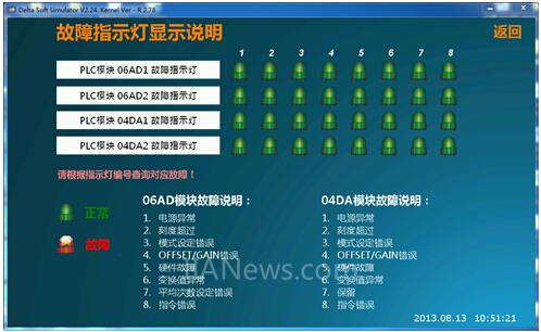 c) 当PLC模拟量模块出现异常时,对应异常指示灯会由绿色变红,以警戒当前异常状态