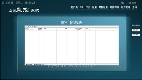 事件记录画面中,普通用户可以进行密码修改的相关操作,管理员可对用户进行添加、删除和密码管理操作;此外,所有成员的登陆、操作信息会被记录下来,有利于管理者对空调控系统的管理