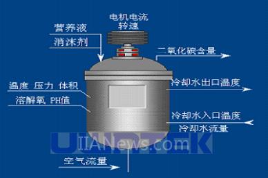 通常有发酵罐温度、发酵罐压力、发酵液体积、空气流量、冷却水进出口温度和流量搅拌马达转速、搅拌马达电流、泡沫高度等,这些物理参数根据不同种类的发酵要求,都可以选择性的选取有关测量仪表来实现自动测量。