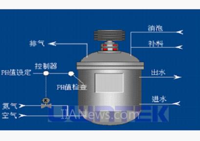 pH是微生物生长的另一个重要环境参数。在发酵过程中,必须严格加以控制,否则会严重影响微生物代谢的进行和代谢产物的合成。在工业生产上,若发酵液pH值偏低、氨氮也偏低的时候,则通过加氨水等方法使其pH值回升;如果pH值偏高而氨氮偏低,可以补入硫酸铵或氯化铵;若pH值和氨氮都偏高,在发酵前期,可适当增加糖的补加量来调整。一般没有其它的控制手段。因此在pH值控制中必须严格控制好调整液的加入量,绝对不能过量。如图2所示,pH值的控制常由pH测量电极和变送器、pH控制器、空气开关和气动开关阀组成。