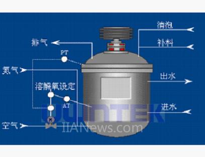 在发酵前期,微生物生长旺盛时期,加入料液满载,搅拌马达全速开动,空气通入量达到最大。这时候,发酵液上浮得很厉害,稍有不慎,就可能会产生逃液现象。此时,必须即时加入消泡剂,以减少泡沫,防止发酵液上浮。消泡控制通常采用双位式的控制方法,当发酵液液面达到一定的高度时,自动打开消泡剂的阀门,当液面降回到正常时,自动关闭消泡剂阀门。