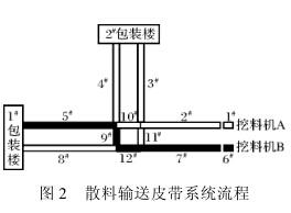 3#散料库散料皮带输送往1#、2#包装楼皮带系统流程见图2。系统有1#、6#挖料机2台;2#、3#、4#、5#、7#、8#输送皮带6条;9#、10#、11#、12#分料器4台。工作时,3个选择开关每次只选择一条路径,分料器自动切换。8种路径是: