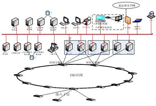 如上图:EMS系统网络主要分为三个部分。底层为西门子工业交换机组成的能源环网,上层为H3C商用交换机组成的中央网络,外部为天融信防火墙,用于对外系统通信。其中,在EMS机房内布置两台H3C S5500-28C-EI交换机组成能源中央网络。