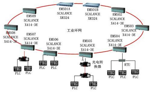 在前进能源管理系统中,由于节点较多、数据量较大我们在环网主干上主要应用了XR324和X414-3E两款较高端的型号。前进能源管理系统工业网络各个节点间的距离一般在2千米以内,主干网络根据系统要求以千兆速率组网。环上EMS01选用SCALANCE X324,其他环网节点选用SCALANCE X414-3E,分支接入点选用非网管型交换机SCALANCE XB004-1LD。