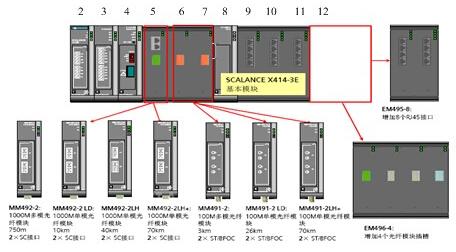 SCALANCE X400系列为模块化交换机,以SCALANCE X414-3E交换机为例,在5号插槽上可接入千兆光纤模块,6、7号插槽上可接入百兆光纤模块,如需再增加模块则须在12插槽上接入EM495-8(8个RJ45端口)或EM496-4(4个介质插槽),具体配置组合方式如下图。在能源系统中除环网所用的2个光口外,如接入子站超过2个则需要增加EM496-4,再配置光纤模块。