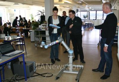 Trelleborg公司一开始就向所有员工介绍了新引入的大批机器人。这里我们可以看到餐饮服务部的助理Annette Jensen正很好奇地使用这个新机器人。几分钟之后她就成功地对这台UR5机器人完成了编程使其执行在罐子里搅拌的动作。