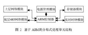 基于ARM的分布处理单元的结构框图见图2,这和一般的分布处理单元的结构非常相似。这里主要把处理单元分为6部分:ARM控制器、上层网络模块、电源管理模块、存储器模块、低层网络模块和时钟模块。ARM控制器和存储模块组成了最基本的嵌入式系统,整个DCS控制系统的数据处理和控制策略都是在这里处理的。上层网络模块主要是指和管理层通信的主/冗余网络和一个实现主/冗余分布处理单元进行数据交换的网络,这部分的主要功能是完成管理层对DCS控制系统的实时检测和实现主/冗余分布处理单元的数据冗余。底层的网络模块是由分为主次的2条485网络组成,此模块主要实现ARM控制器的I/O卡件之间的数据通信。存储器模块可分为两部分,一部分用来管理存放操作系统,另一部分用来管理存放实时数据。电源模块和时钟模块分别实现电源的管理和时钟的管理。