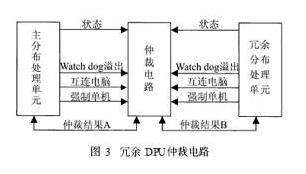 从图3中可看出双分布处理单元仲裁电路工作原理为将分布处理单元各自自身之诊断结果加到仲裁电路上,并读取相应的仲裁结果,以确定自身之主辅状态。通过编程,确定各状态的优先级,由于双分布处理单元均根据仲裁之结果确定各自之主辅状态,故只要仲裁结果变化了,双分布处理单元则自动进行切换。