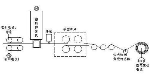 铝塑管生产线主要是由铝带放卷、成型、包胶(押出机)、成型管牵引、收卷(或者切断)。其中铝带放卷和成型管的牵引是采用由丹佛斯FC302变频器开环转矩实现的,众所周知,传动系统的运动状态满足系统的运动方程式:TM- TL=(GD2/375)*(dn/dt),式中:TM为电机的电磁转矩,TL 为生产机械的负载转矩,包含电机轴以及与轴连接的机械系统的转矩,管的张力所形成的反转矩,GD2为转动部分的转动惯量。