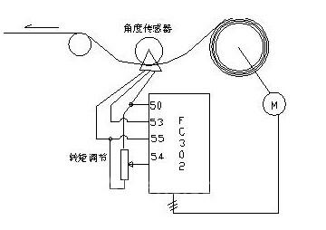 对于铝带放卷时候,其张力要求不是很严格,精度也不很高,就由摆锤压紧铝带,其中用一个角度传感器来检测其摆锤的角度大小,角度传感器的输出信号为0-5VDC。放卷的速度控制由角度控制本身输出来控制,其变频器的控制原理图如下: