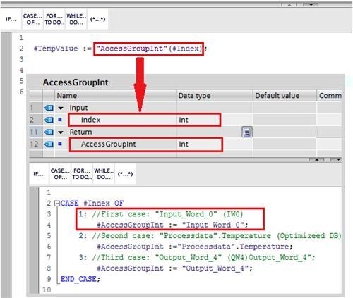 创建一个功能,并声明输入变量为"Int"类型。图.01 显示了对于"AccessGroupInt"功能块的编程示例,通过index进行间接寻址并返回值。可以在程序中直接使用间接访问,例如使用指令#TempValue:= "AccessGroupInt"(#Index);。这一编程方法