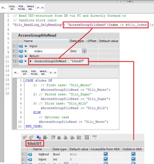 创建的PLC数据类型"SiloUDT"用于寻址包含不同数据类型的DB变量。 "AccessGroupSiloRead"功能块用于读出返回值,是由PLC 数据类型 "SiloUDT"定义的。基于此可以在一个FB中间接访问,例如如图.03所示的指令: