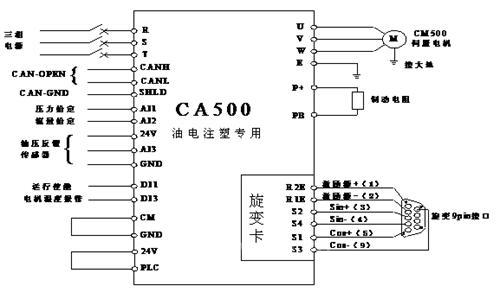 四方注塑机同步伺服油泵系统方案,以CA500系列重载型伺服驱动器为控制平台,搭配电液注塑伺服专用适配卡和旋变适配卡,与CM500同步电机组成伺服闭环控制系统。