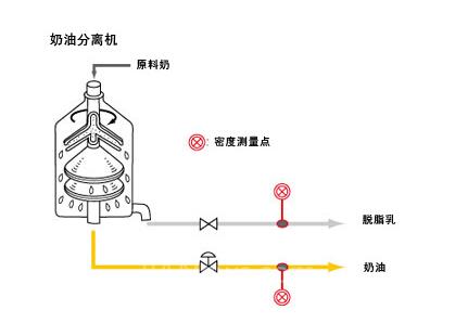 脱脂乳是指从原料奶中除去奶油后的产品。除去奶油可以使脱脂乳中的脂肪含量尽可能接近指定范围的下限。为此,控制奶油和脱脂乳中的脂肪含量十分重要。奶油和牛奶中的脂肪含量与其密度直接相关,因此可以通过测量密度进行控制。