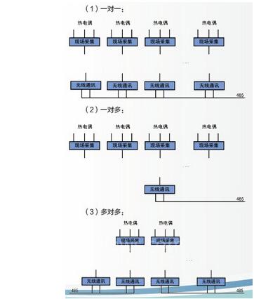 无线通讯现场采集模块的组网方式有一对一、一对多、多对多等组网方式,采集数据由RS485(MODBUS RTU协议)输出给操作站,采用通讯方式配置DCS通讯模件,在操作站集中显示。