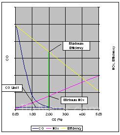 图中显示了在一个典型燃烧应用中,过氧与NOx和CO的关系。也显示了效率与过氧之间的关系。由于过氧减少,NOx减少,而CO和效率提高。为了尽量减少NOx的产生和最大限度地提高效率,应尽量减少过氧。然而,设备的安全和环境法规的限制了可以产生的CO量。结果,过氧只能降低到CO所约束的量。从这个角度看,燃烧已经优化,运行在最大允许的CO生产量对应于最低的NOx生产量和最大的效率。