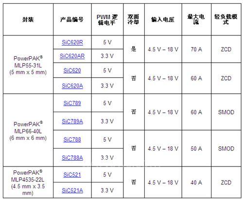新器件采用标准的6mm x 6mm PowerPAK MLP66-40L、新型5mm x 5mm PowerPAK MLP55-31L和4.5mm x 3.5mm PowerPAK MLP4535-22L封装。