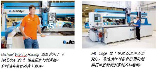 Jet Edge 公司提供各种适用于最多样化应用范围的高压水切割系统:在 2010 年墨西哥湾漏油事件中,该公司迅速为 BP(英国石油)公司开发了一套高压水切割系统,切掉了水下 5000 英尺(1500 米)深处堵塞密封系统的水合物冰晶。另一个备受瞩目的例子是 Michael Waltrip Racing 采用了 5 轴 EDGE X-5 高压水切割系统。这家美国的赛车运动团队每年组装约 56 辆车,采用高压水切割头为每个车队的 NASCAR Sprint Cup 汽车切割 1000 多个机械零部件。