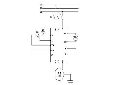 用变频控制,变频器自身具有多种过流、过压、过载等保护功能,运行稳定、可靠。接线图如下所示:SB1为启动按钮,SB2为停止按钮,X2端子定义为运行自保持功能,AO1作为模拟量的输出显示电机的转速,TA、TC为故障输出信号。