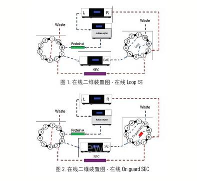 赛默飞推出的方案基于Ultimate 3000 DGLC 双三元液相色谱系统,一维使用MabPac Protain A亲和色谱柱对单抗溶液进行分离,通过阀切换将收集到loop环(或者富集柱)中的单抗样品转移到二维,利用SEC色谱柱将样品中的聚体和单抗进行分离,从而实现全自动在线二维液相分离单抗药物的目的。该方案可以实现单抗药物的全自动滴度分析和聚体分离,节约时间,提高工作效率,同样该方法也适用于全自动滴度分析和电荷异构单抗分离。更为重要的是该方法可以整合不同分离原理的液相色谱方法,为生物制药和蛋白分析建立一个方法开发平台,从而让Ultimate 3000 DGLC 双三元液相色谱更好地为生物制药行业服务。